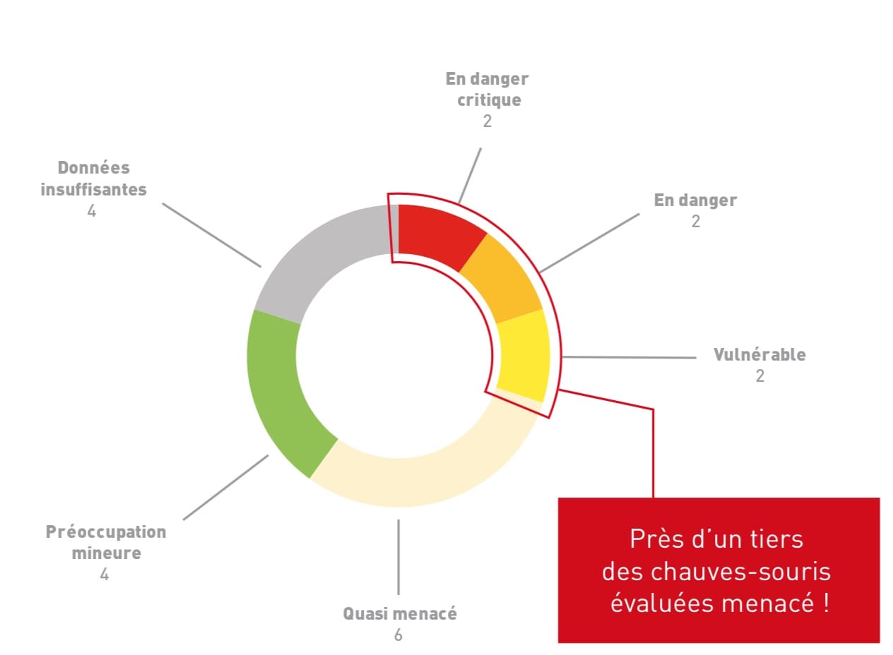 Cette liste est pour le moins alarmante quand on sait que même la Pipistrelle commune, espèce la plus répandue en France, fait partie des espèces quasi-menacées.